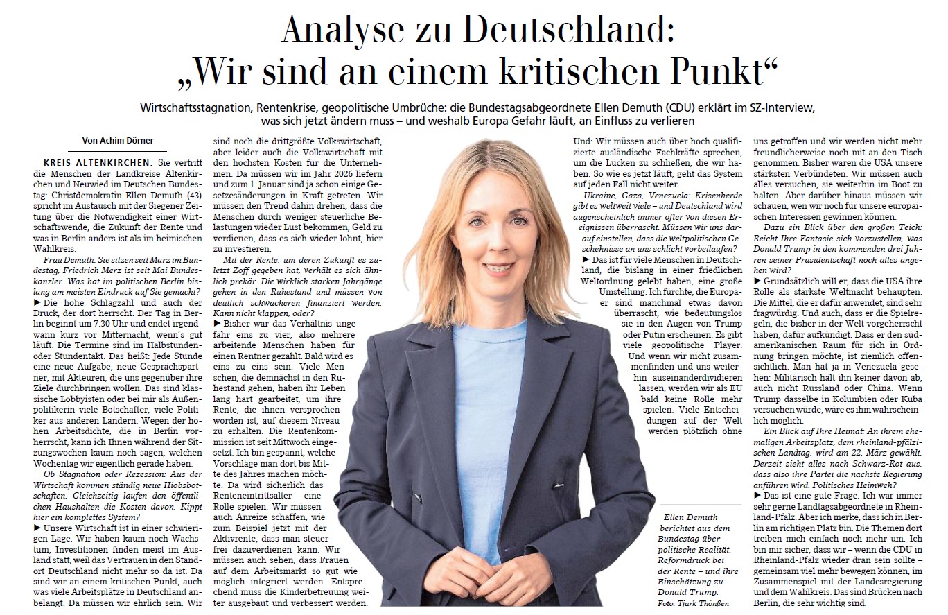 Lesen Sie im Folgenden das Interview von Ellen Demuth mit der Siegener Zeitung, erschienen in der Ausgabe vom Montag, 12. Januar 2026: