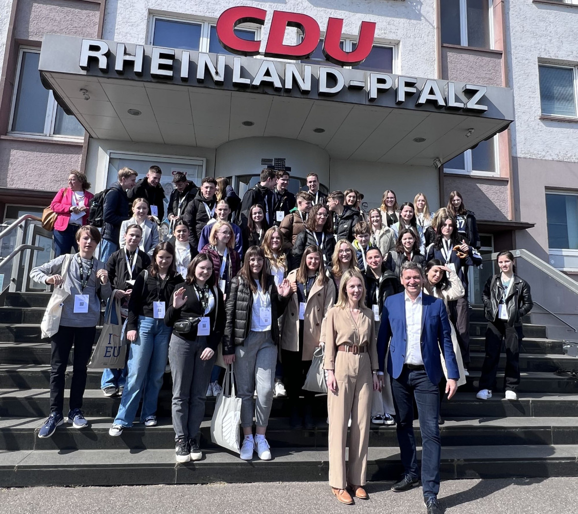 Am Morgen begrüßte Landtagsabgeordnete und stellvertretende Landesvorsitzende Ellen Demuth gemeinsam mit dem CDU-Landesvorsitzenden Christian Baldauf die Gruppe. Die CDU-Landesgeschäftsstelle hatte im großen Sitzungssaal für jeden Info-Pakete vorbereitet. Eine lockere Vorstellungsrunde sorgte für das erste Kennenlernen, und stimmte auf den weiteren Tagesablauf ein. Dieser setze sich mit einer vom Besucherdienst begleiteten informativen Führung durch den Landtag fort. Beim Mittagessen im Landtagsrestaurant plauderten alle über ihre ersten Erfahrungen.